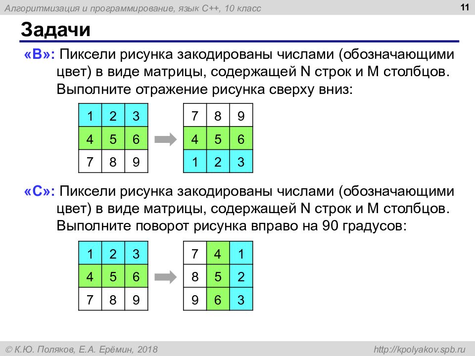 11 « B »: Пиксели рисунка закодированы числами (обозначающими цвет) в виде матрицы, содержащей N строк и M столбцов. Выполните отражение рисунка сверху вниз: 1 2 3 4 5 6 7 8 9 7 8 9 4 5 6 1 2 3 «С»: Пиксели рисунка закодированы числами (обозначающими цвет) в виде матрицы, содержащей N строк и M столбцов. Выполните поворот рисунка вправо на 90 градусов: 1 2 3 4 5 6 7 8 9 7 4 1 8 5 2 9 6 3