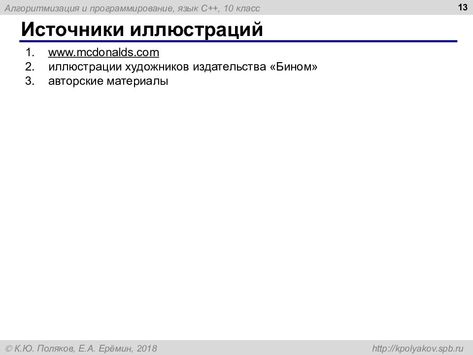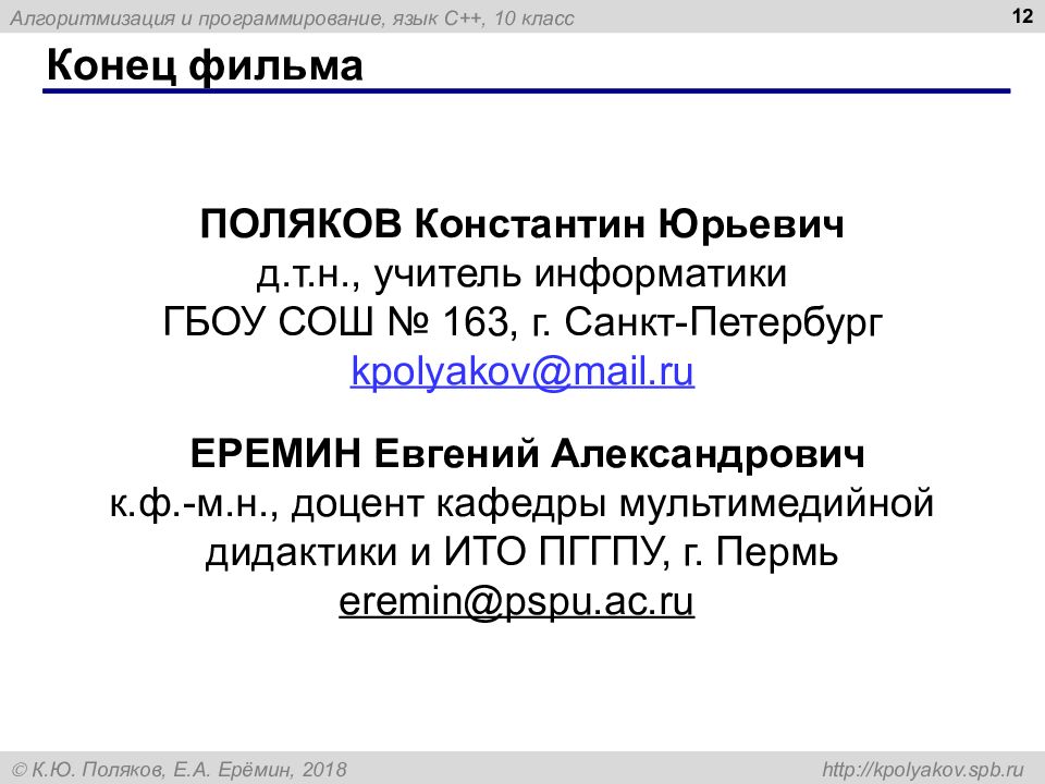 12 Конец фильма ПОЛЯКОВ Константин Юрьевич д.т.н., учитель информатики ГБОУ СОШ № 163, г. Санкт-Петербург kpolyakov@mail.ru ЕРЕМИН Евгений Александрович к.ф.-м.н., доцент кафедры мультимедийной дидактики и ИТО ПГГПУ, г. Пермь eremin@pspu.ac.ru