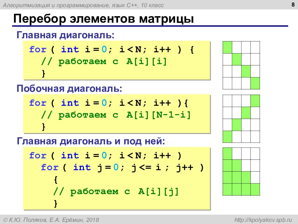 8 Главная диагональ: for ( int i = 0 ; i < N; i ++ ) { // работаем с A[ i ][ i ] } Побочная диагональ: for ( int i = 0 ; i < N; i ++ ){ // работаем с A[ i ][N-1-i] } Главная диагональ и под ней: for ( int i = 0 ; i < N; i ++ ) for ( int j = 0 ; j <= i ; j++ ) { // работаем с A [ i ][ j ] }