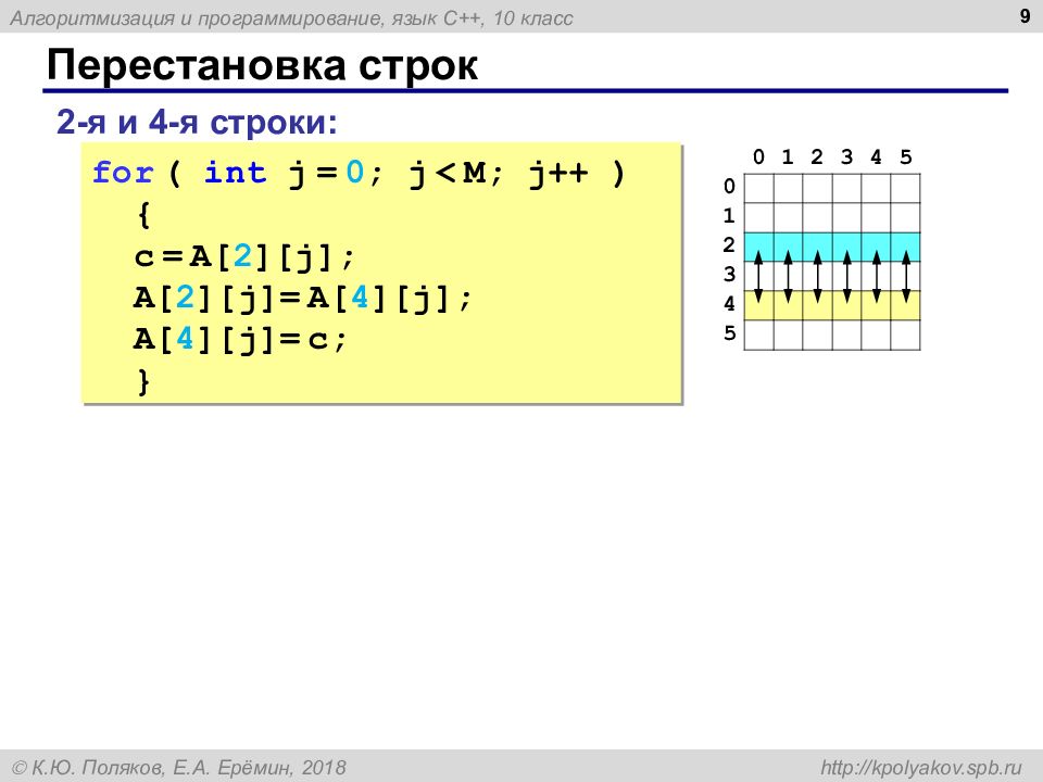 9 2-я и 4-я строки: for ( int j = 0 ; j < M; j++ ) { c = A[ 2 ][j]; A[ 2 ][j]= A[ 4 ][j]; A[ 4 ][j]= c; } 0 1 2 3 4 5 0 1 2 3 4 5