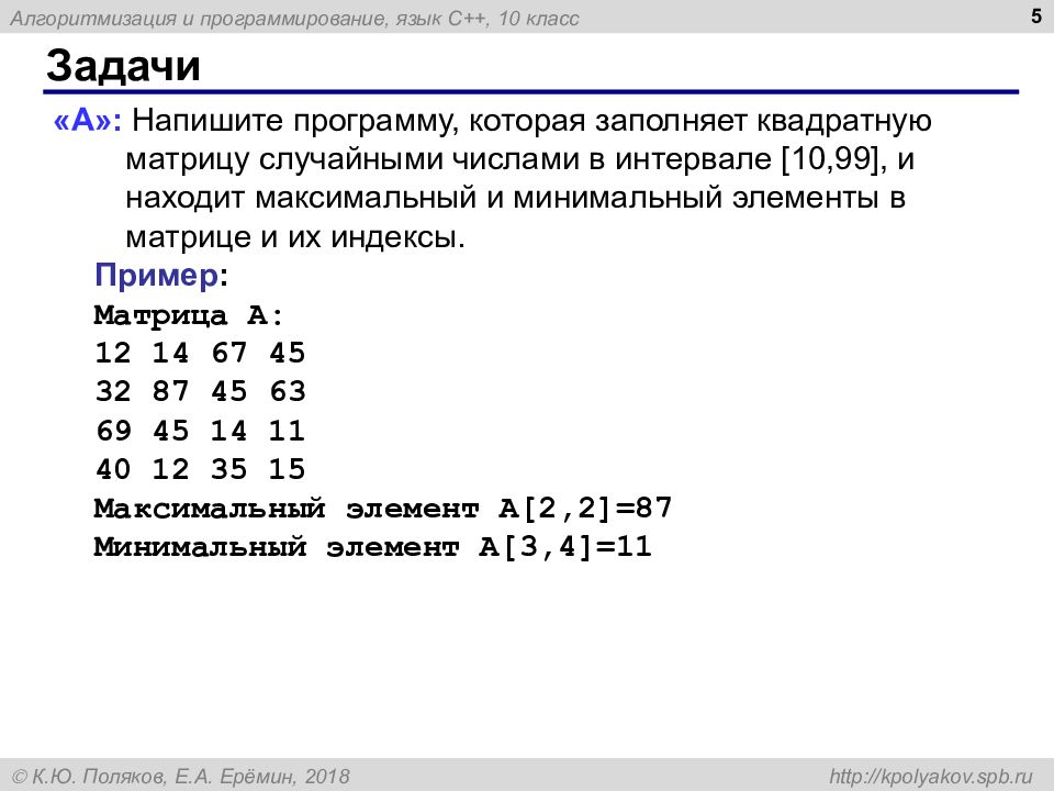 5 « A »: Напишите программу, которая заполняет квадратную матрицу случайными числами в интервале [10,99], и находит максимальный и минимальный элементы в матрице и их индексы. Пример : Матрица А: 12 14 67 45 32 87 45 63 69 45 14 11 40 12 35 15 Максимальный элемент A[2,2]=87 Минимальный элемент A[3,4]=11