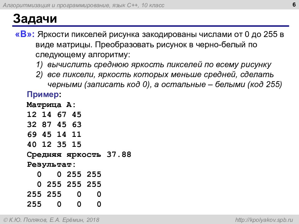 6 « B »: Яркости пикселей рисунка закодированы числами от 0 до 255 в виде матрицы. Преобразовать рисунок в черно-белый по следующему алгоритму: вычислить среднюю яркость пикселей по всему рисунку все пиксели, яркость которых меньше средней, сделать черными (записать код 0), а остальные – белыми (код 255) Пример : Матрица А: 12 14 67 45 32 87 45 63 69 45 14 11 40 12 35 15 Средняя яркость 37.88 Результат: 0 0 255 255 0 255 255 255 255 255 0 0 255 0 0 0