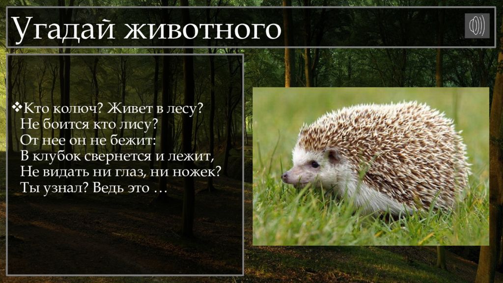 Кто колюч? Живет в лесу? Не боится кто лису? От нее он не бежит: В клубок свернется и лежит, Не видать ни глаз, ни ножек? Ты узнал? Ведь это …