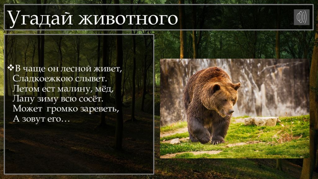В чаще он лесной живет, Сладкоежкою слывет. Летом ест малину, мёд, Лапу зиму всю сосёт. Может громко зареветь, А зовут его…