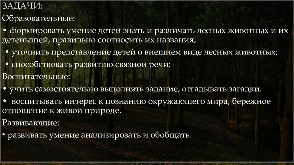 ЗАДАЧИ: Образовательные: • формировать умение детей знать и различать лесных животных и их детенышей, правильно соотносить их названия; • уточнить представление детей о внешнем виде лесных животных; • способствовать развитию связной речи ; Воспитательные: • учить самостоятельно выполнять задание, отгадывать загадки. • воспитывать интерес к познанию окружающего мира, бережное отношение к живой природе. Развивающие: р азвивать умение анализировать и обобщать.
