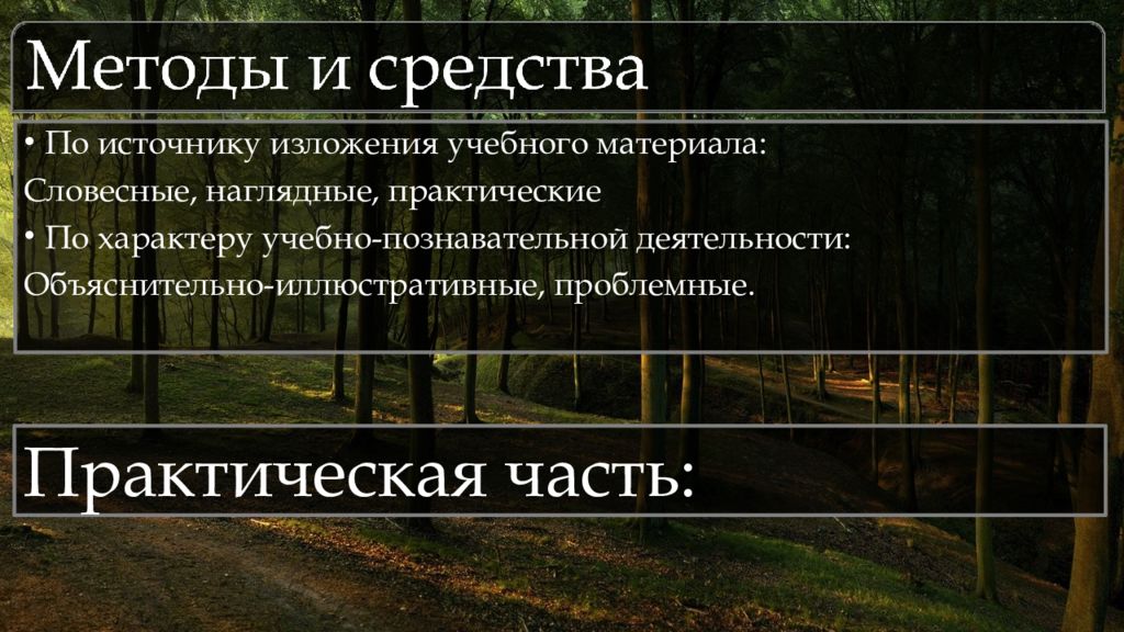П о источнику изложения учебного материала: Словесные, наглядные, практические П о характеру учебно-познавательной деятельности: Объяснительно-иллюстративные, проблемные.