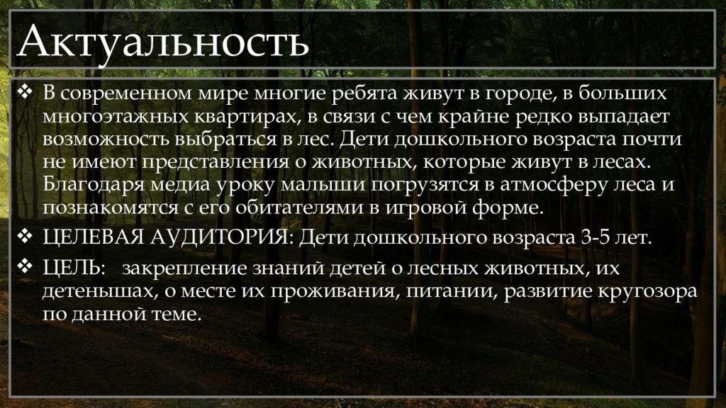В современном мире многие ребята живут в городе, в больших многоэтажных квартирах, в связи с чем крайне редко выпадает возможность выбраться в лес. Дети дошкольного возраста почти не имеют представления о животных, которые живут в лесах. Благодаря медиа уроку малыши погрузятся в атмосферу леса и познакомятся с его обитателями в игровой форме. Ц ЕЛЕВАЯ АУДИТОРИЯ: Дети дошкольного возраста 3-5 лет. ЦЕЛЬ: закрепление знаний детей о лесных животных, их детенышах, о месте их проживания, питании, развитие кругозора по данной теме.