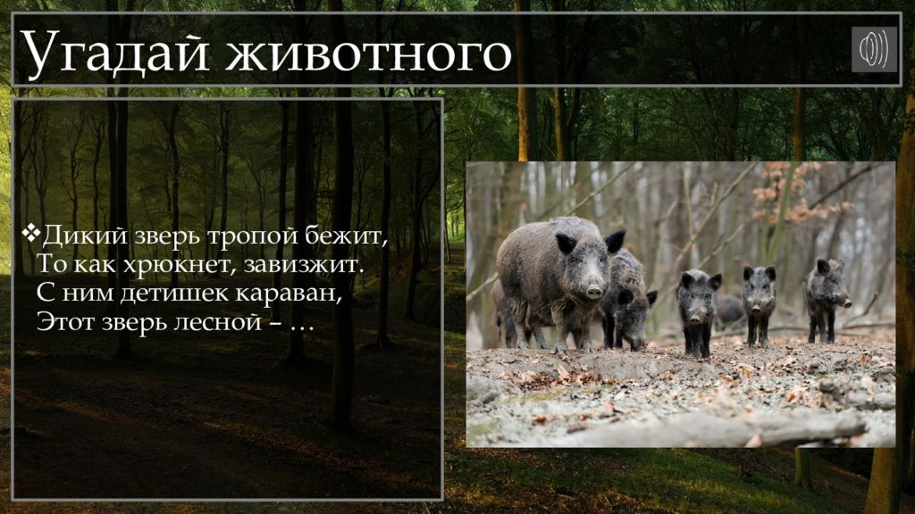 Дикий зверь тропой бежит, То как хрюкнет, завизжит. С ним детишек караван, Этот зверь лесной – …