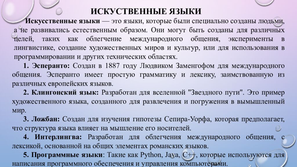 ИСКУСТВЕННЫЕ ЯЗЫКИ Искусственные языки — это языки, которые были специально созданы людьми, а не развивались естественным образом. Они могут быть созданы для различных целей, таких как облегчение международного общения, эксперименты в лингвистике, создание художественных миров и культур, или для использования в программировании и других технических областях. 1. Эсперанто : Создан в 1887 году Людвиком Заменгофом для международного общения. Эсперанто имеет простую грамматику и лексику, заимствованную из различных европейских языков. 2. Клингонский язык : Разработан для вселенной " Звездного пути ". Это пример художественного языка, созданного для развлечения и погружения в вымышленный мир. 3. Ложбан : Создан для изучения гипотезы Сепира-Уорфа, которая предполагает, что структура языка влияет на мышление его носителей. 4. Интерлингва : Разработан для облегчения международного общения, с лексикой, основанной на общих элементах романских языков. 5. Программные языки : Такие как Python, Java, C++, которые используются для написания программного обеспечения и управления компьютерами.