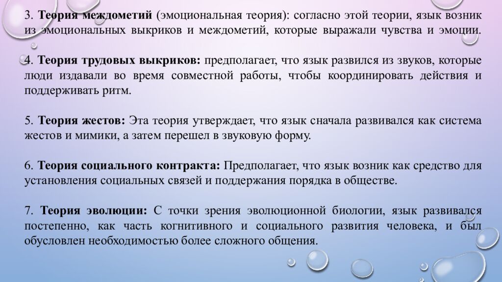 3. Теория междометий (эмоциональная теория): согласно этой теории, язык возник из эмоциональных выкриков и междометий, которые выражали чувства и эмоции. 4. Теория трудовых выкриков: предполагает, что язык развился из звуков, которые люди издавали во время совместной работы, чтобы координировать действия и поддерживать ритм. 5. Теория жестов : Эта теория утверждает, что язык сначала развивался как система жестов и мимики, а затем перешел в звуковую форму. 6. Теория социального контракта : Предполагает, что язык возник как средство для установления социальных связей и поддержания порядка в обществе. 7. Теория эволюции : С точки зрения эволюционной биологии, язык развивался постепенно, как часть когнитивного и социального развития человека, и был обусловлен необходимостью более сложного общения.