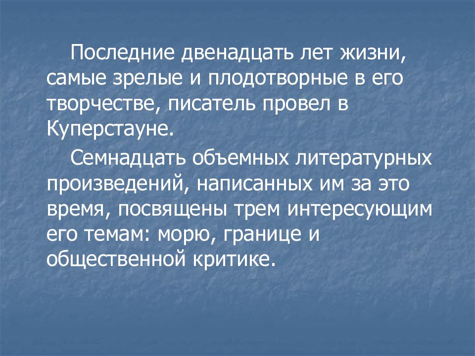 Последние двенадцать лет жизни, самые зрелые и плодотворные в его творчестве, писатель провел в Куперстауне. Семнадцать объемных литературных произведений, написанных им за это время, посвящены трем интересующим его темам: морю, границе и общественной критике.