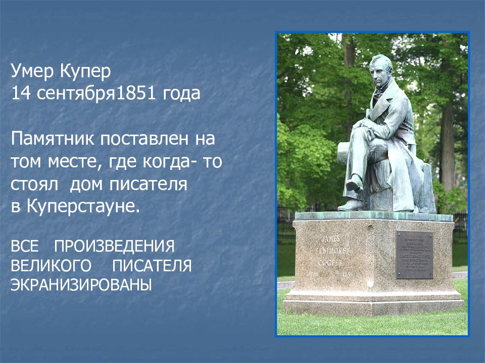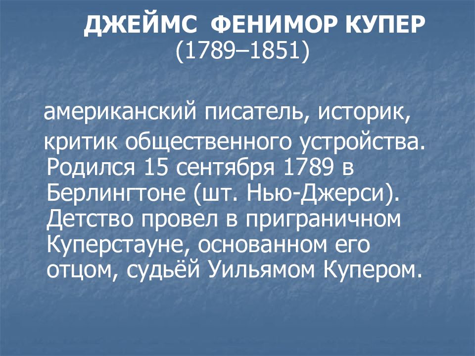 ДЖЕЙМС ФЕНИМОР КУПЕР (1789–1851) американский писатель, историк, критик общественного устройства. Родился 15 сентября 1789 в Берлингтоне (шт. Нью-Джерси). Детство провел в приграничном Куперстауне, основанном его отцом, судьёй Уильямом Купером.