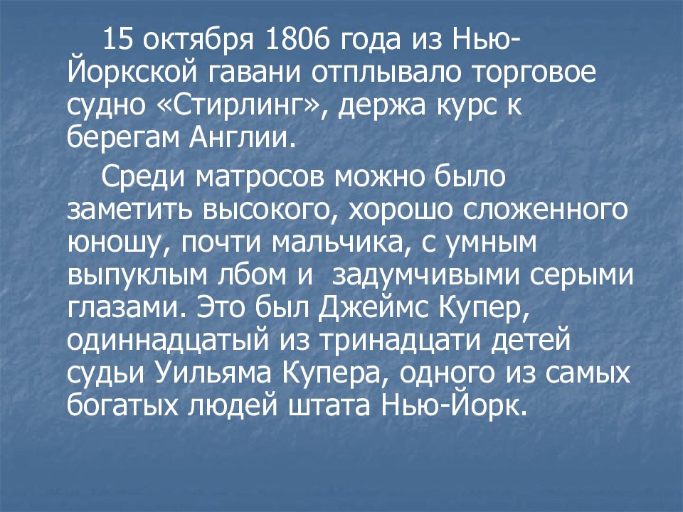 15 октября 1806 года из Нью-Йоркской гавани отплывало торговое судно «Стирлинг», держа курс к берегам Англии. Среди матросов можно было заметить высокого, хорошо сложенного юношу, почти мальчика, с умным выпуклым лбом и задумчивыми серыми глазами. Это был Джеймс Купер, одиннадцатый из тринадцати детей судьи Уильяма Купера, одного из самых богатых людей штата Нью-Йорк.