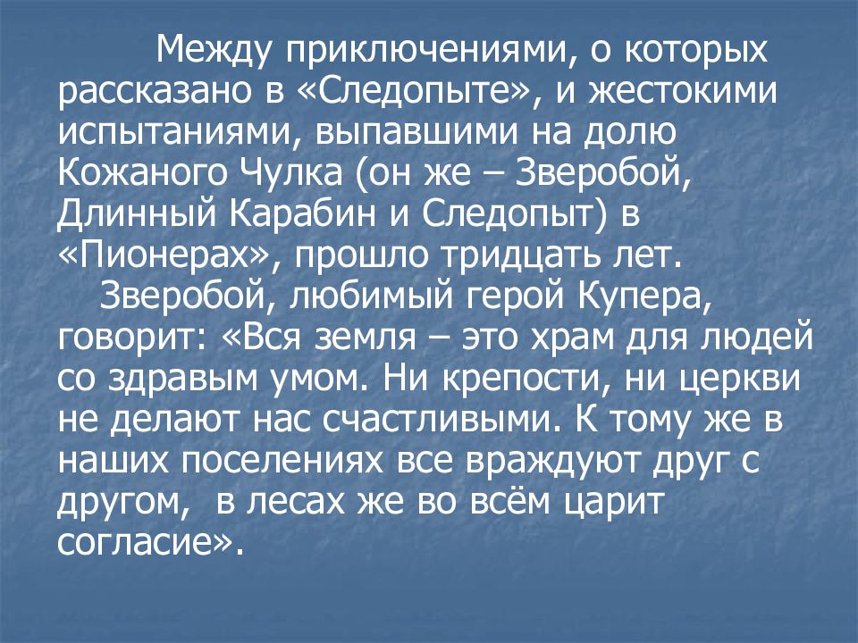 Между приключениями, о которых рассказано в «Следопыте», и жестокими испытаниями, выпавшими на долю Кожаного Чулка (он же – Зверобой, Длинный Карабин и Следопыт) в «Пионерах», прошло тридцать лет. Зверобой, любимый герой Купера, говорит: «Вся земля – это храм для людей со здравым умом. Ни крепости, ни церкви не делают нас счастливыми. К тому же в наших поселениях все враждуют друг с другом, в лесах же во всём царит согласие».