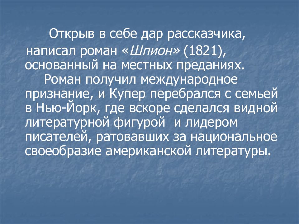 Открыв в себе дар рассказчика, написал роман « Шпион» (1821), основанный на местных преданиях. Роман получил международное признание, и Купер перебрался с семьей в Нью-Йорк, где вскоре сделался видной литературной фигурой и лидером писателей, ратовавших за национальное своеобразие американской литературы.