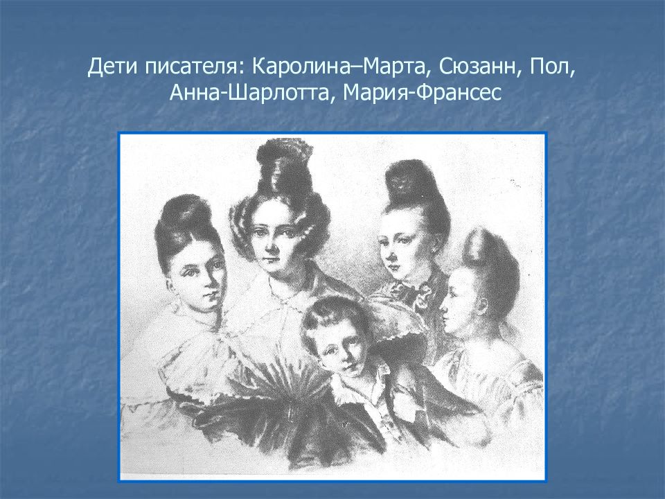 Слайд 8: Дети писателя: Каролина–Марта, Сюзанн, Пол, Анна-Шарлотта, Мария-Франсес