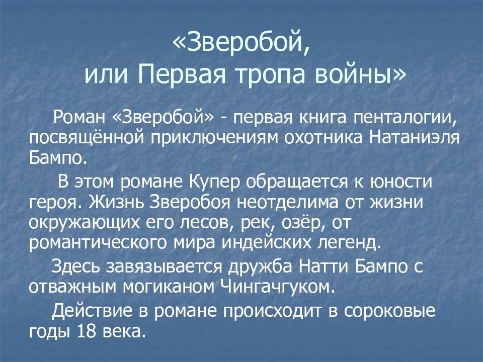 Роман «Зверобой» - первая книга пенталогии, посвящённой приключениям охотника Натаниэля Бампо. В этом романе Купер обращается к юности героя. Жизнь Зверобоя неотделима от жизни окружающих его лесов, рек, озёр, от романтического мира индейских легенд. Здесь завязывается дружба Натти Бампо с отважным могиканом Чингачгуком. Действие в романе происходит в сороковые годы 18 века.