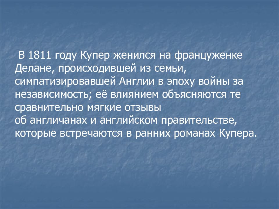 В 1811 году Купер женился на француженке Делане, происходившей из семьи, симпатизировавшей Англии в эпоху войны за независимость; её влиянием объясняются те сравнительно мягкие отзывы об англичанах и английском правительстве, которые встречаются в ранних романах Купера.