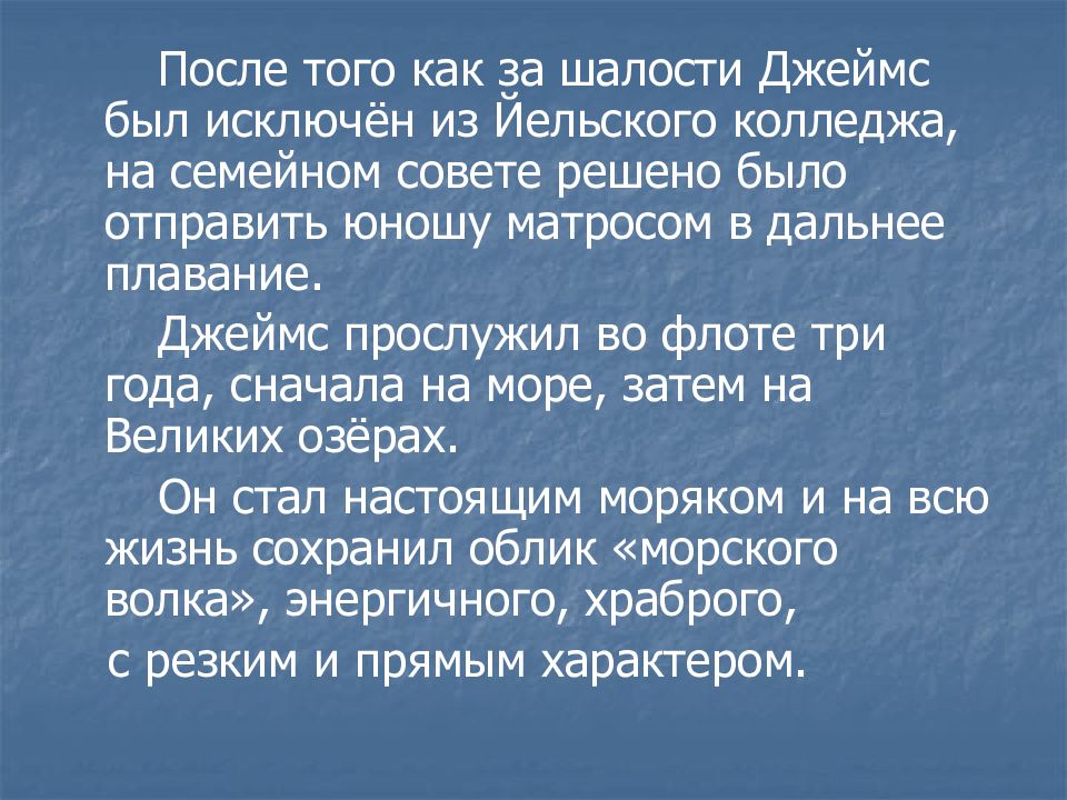 После того как за шалости Джеймс был исключён из Йельского колледжа, на семейном совете решено было отправить юношу матросом в дальнее плавание. Джеймс прослужил во флоте три года, сначала на море, затем на Великих озёрах. Он стал настоящим моряком и на всю жизнь сохранил облик «морского волка», энергичного, храброго, с резким и прямым характером.