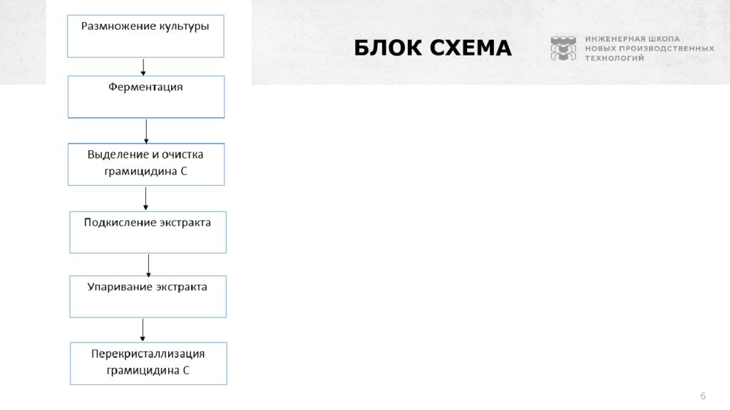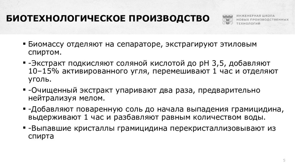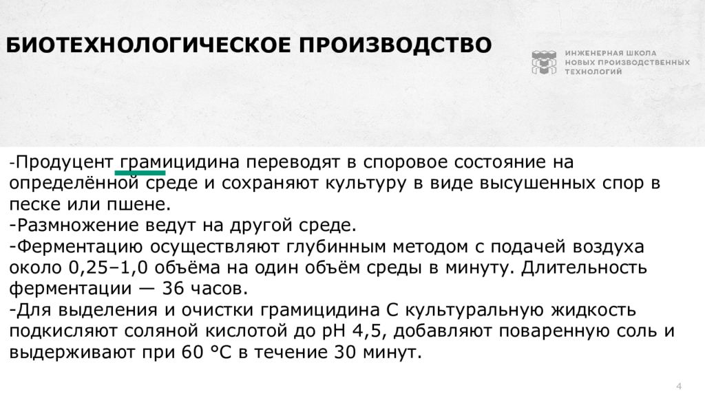 4 Биотехнологическое производство - Продуцент грамицидина переводят в споровое состояние на определённой среде и сохраняют культуру в виде высушенных спор в песке или пшене. -Размножение ведут на другой среде. -Ферментацию осуществляют глубинным методом с подачей воздуха около 0,25–1,0 объёма на один объём среды в минуту. Длительность ферментации — 36 часов. -Для выделения и очистки грамицидина С культуральную жидкость подкисляют соляной кислотой до рН 4,5, добавляют поваренную соль и выдерживают при 60 °С в течение 30 минут.