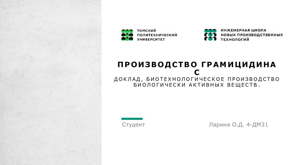 Первый слайд презентации: Производство грамицидина С Доклад, биотехнологическое производство биологически активных веществ