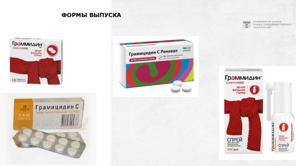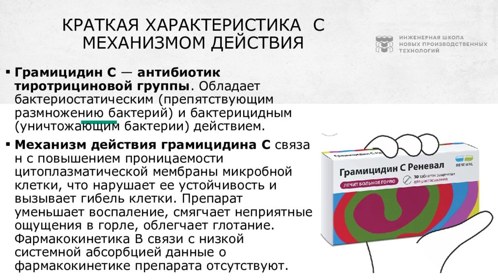 2 Краткая характеристика с механизмом действия Грамицидин С — антибиотик тиротрициновой группы. Обладает бактериостатическим (препятствующим размножению бактерий) и бактерицидным (уничтожающим бактерии) действием. Механизм действия грамицидина С связан с повышением проницаемости цитоплазматической мембраны микробной клетки, что нарушает ее устойчивость и вызывает гибель клетки. Препарат уменьшает воспаление, смягчает неприятные ощущения в горле, облегчает глотание. Фармакокинетика В связи с низкой системной абсорбцией данные о фармакокинетике препарата отсутствуют.