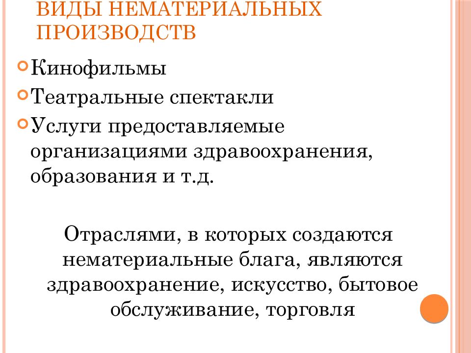 Кинофильмы Театральные спектакли Услуги предоставляемые организациями здравоохранения, образования и т.д. Отраслями, в которых создаются нематериальные блага, являются здравоохранение, искусство, бытовое обслуживание, торговля