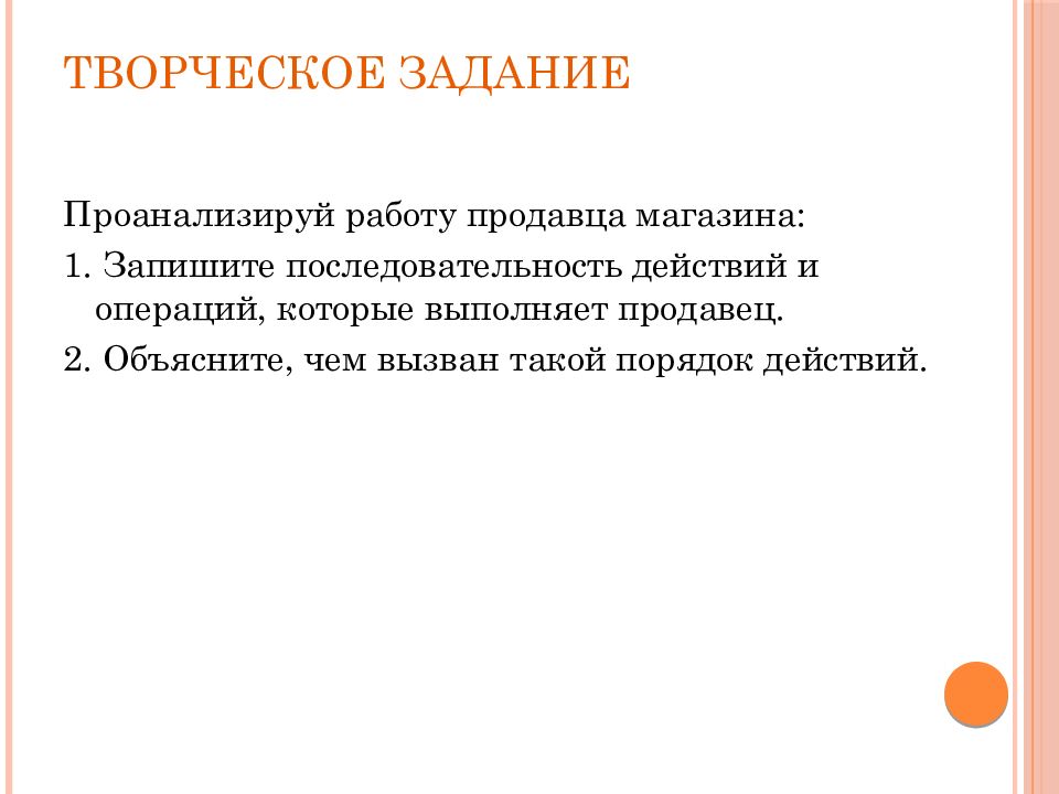 Проанализируй работу продавца магазина: 1. Запишите последовательность действий и операций, которые выполняет продавец. 2. Объясните, чем вызван такой порядок действий.