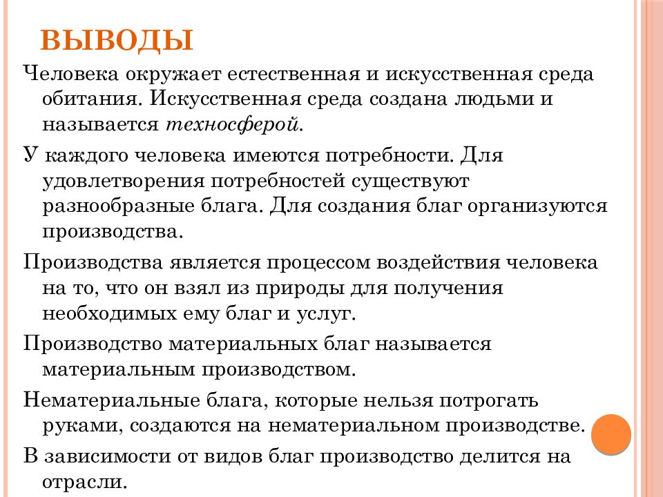 Человека окружает естественная и искусственная среда обитания. Искусственная среда создана людьми и называется техносферой. У каждого человека имеются потребности. Для удовлетворения потребностей существуют разнообразные блага. Для создания благ организуются производства. Производства является процессом воздействия человека на то, что он взял из природы для получения необходимых ему благ и услуг. Производство материальных благ называется материальным производством. Нематериальные блага, которые нельзя потрогать руками, создаются на нематериальном производстве. В зависимости от видов благ производство делится на отрасли.