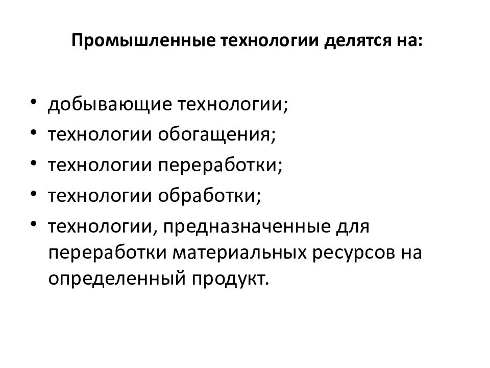 добывающие технологии; технологии обогащения; технологии переработки; технологии обработки; технологии, предназначенные для переработки материальных ресурсов на определенный продукт.