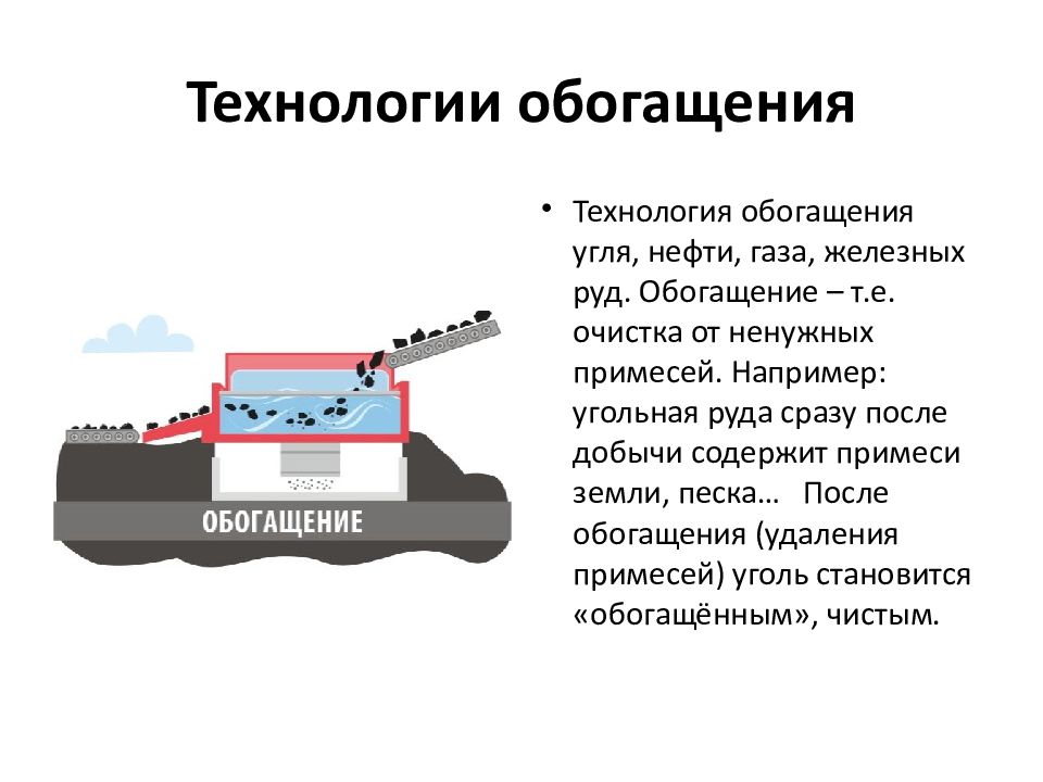 Технология обогащения угля, нефти, газа, железных руд. Обогащение – т.е. очистка от ненужных примесей. Например: угольная руда сразу после добычи содержит примеси земли, песка… После обогащения (удаления примесей) уголь становится «обогащённым», чистым.