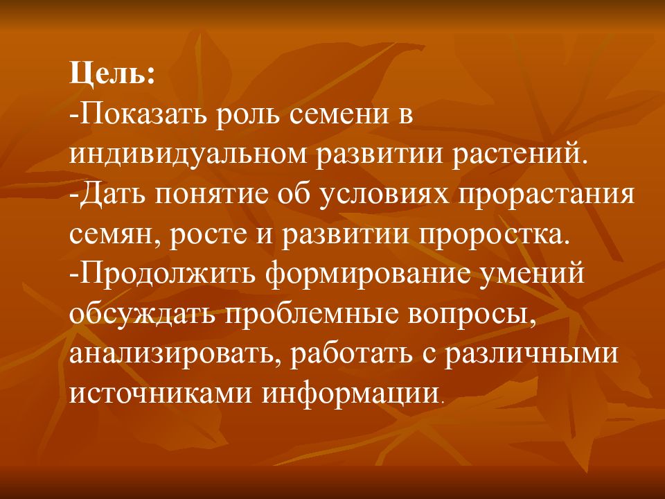 Цель: -Показать роль семени в индивидуальном развитии растений. -Дать понятие об условиях прорастания семян, росте и развитии проростка. -Продолжить формирование умений обсуждать проблемные вопросы, анализировать, работать с различными источниками информации.