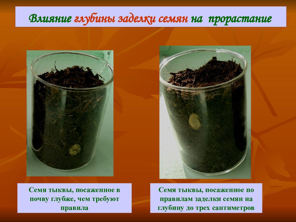 Семя тыквы, посаженное по правилам заделки семян на глубину до трех сантиметров Семя тыквы, посаженное в почву глубже, чем требуют правила