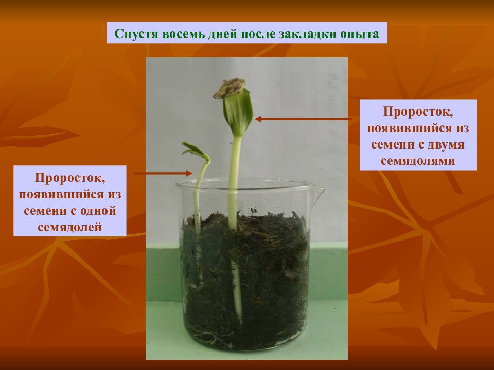 Спустя восемь дней после закладки опыта Проросток, появившийся из семени с двумя семядолями Проросток, появившийся из семени с одной семядолей