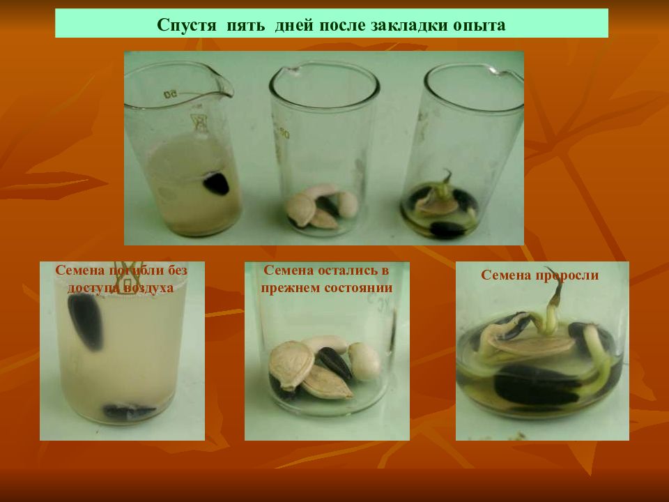 Спустя пять дней после закладки опыта Семена остались в прежнем состоянии Семена погибли без доступа воздуха Семена проросли
