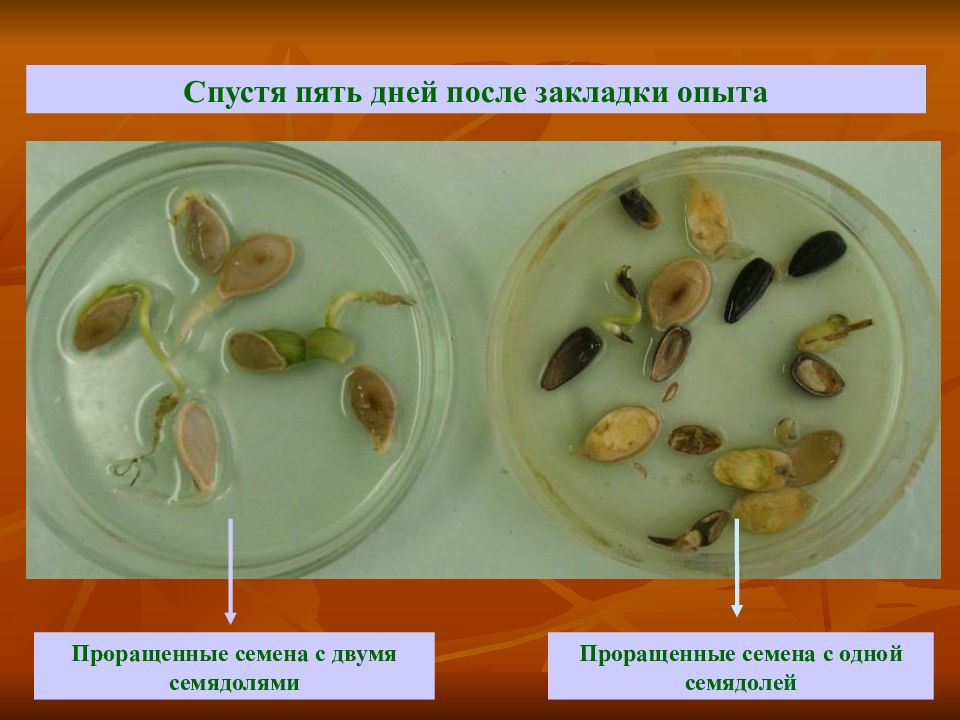 Спустя пять дней после закладки опыта Проращенные семена с двумя семядолями Проращенные семена с одной семядолей