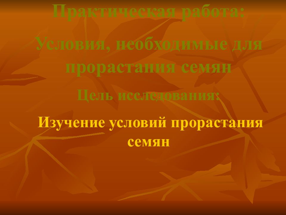 Практическая работа: Условия, необходимые для прорастания семян Цель исследования: Изучение условий прорастания семян