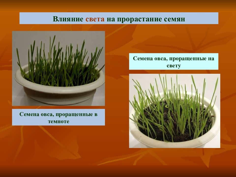 Семена овса, проращенные в темноте Семена овса, проращенные на свету Влияние света на прорастание семян