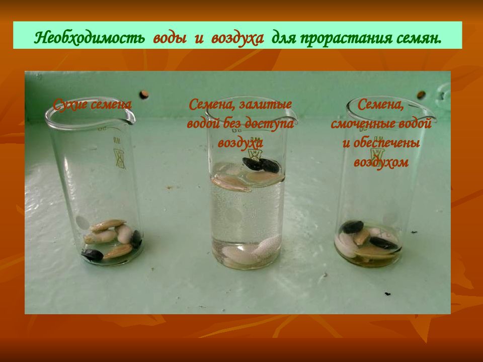 Сухие семена Семена, залитые водой без доступа воздуха Семена, смоченные водой и обеспечены воздухом Необходимость воды и воздуха для прорастания семян.