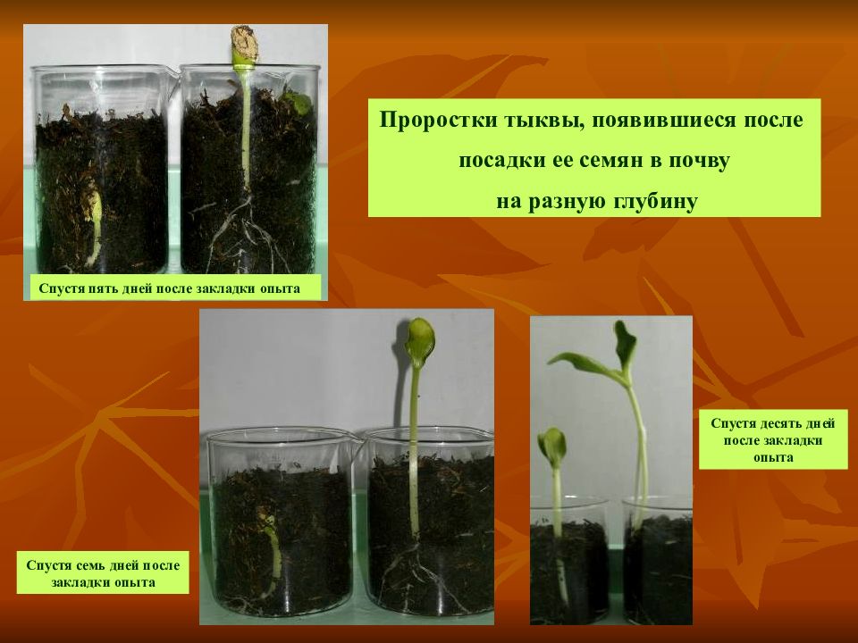 Проростки тыквы, появившиеся после посадки ее семян в почву на разную глубину Спустя пять дней после закладки опыта Спустя семь дней после закладки опыта Спустя десять дней после закладки опыта