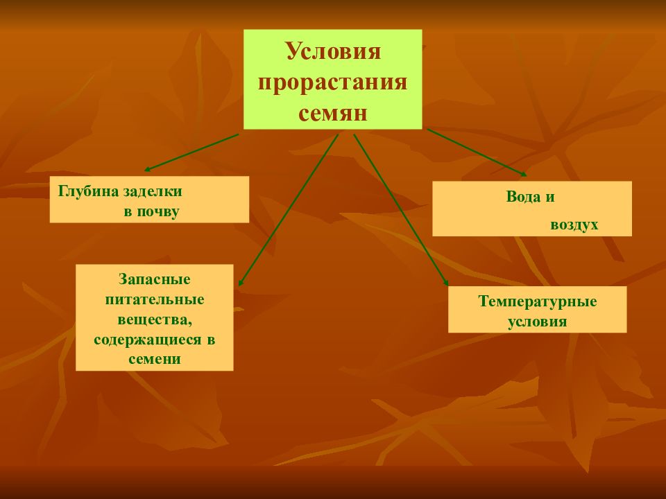 Условия прорастания семян Запасные питательные вещества, содержащиеся в семени Температурные условия Вода и воздух Глубина заделки в почву