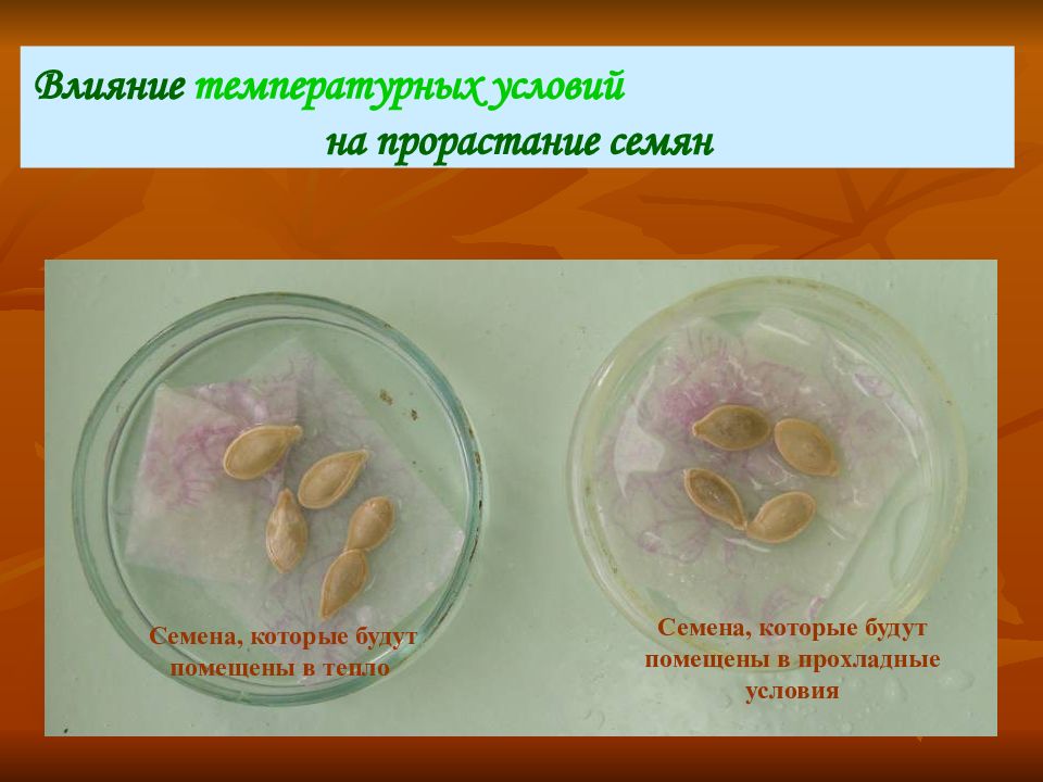 Влияние температурных условий на прорастание семян Семена, которые будут помещены в тепло Семена, которые будут помещены в прохладные условия