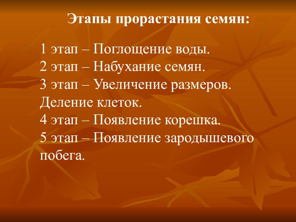 Этапы прорастания семян: 1 этап – Поглощение воды. 2 этап – Набухание семян. 3 этап – Увеличение размеров. Деление клеток. 4 этап – Появление корешка. 5 этап – Появление зародышевого побега.