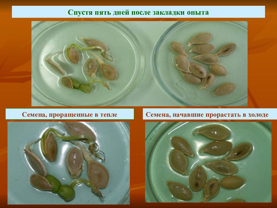 Семена, проращенные в тепле Семена, начавшие прорастать в холоде Спустя пять дней после закладки опыта