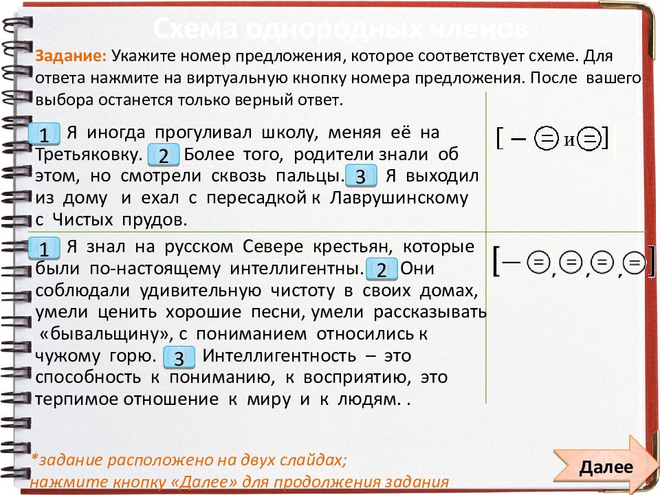Задание: Укажите номер предложения, которое соответствует схеме. Для ответа нажмите на виртуальную кнопку номера предложения. После вашего выбора останется только верный ответ. Далее (1) Я иногда прогуливал школу, меняя её на Третьяковку. (2) Более того, родители знали об этом, но смотрели сквозь пальцы. (3) Я выходил из дому и ехал с пересадкой к Лаврушинскому с Чистых прудов. *задание расположено на двух слайдах; нажмите кнопку «Далее» для продолжения задания 1 2 3 (1) Я знал на русском Севере крестьян, которые были по-настоящему интеллигентны. (2) Они соблюдали удивительную чистоту в своих домах, умели ценить хорошие песни, умели рассказывать «бывальщину », с пониманием относились к чужому горю. ( 3) Интеллигентность – это способность к пониманию, к восприятию, это терпимое отношение к миру и к людям.. 1 3 2