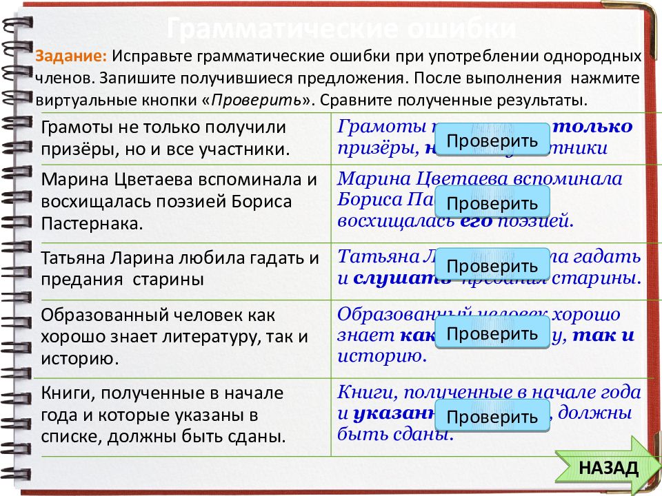 Грамоты не только получили призёры, но и все участники. Грамоты получили не только призёры, но и все участники Грамматические ошибки Задание: Исправьте грамматические ошибки при употреблении однородных членов. Запишите получившиеся предложения. После выполнения нажмите виртуальные кнопки « Проверить ». Сравните полученные результаты. Проверить НАЗАД Марина Цветаева вспоминала и восхищалась поэзией Бориса Пастернака. Марина Цветаева вспоминала Бориса Пастернака и восхищалась его поэзией. Проверить Татьяна Ларина любила гадать и предания старины Татьяна Ларина любила гадать и слушать предания старины. Проверить Образованный человек как хорошо знает литературу, так и историю. Образованный человек хорошо знает как литературу, так и историю. Проверить Книги, полученные в начале года и которые указаны в списке, должны быть сданы. Книги, полученные в начале года и указанные в списке, должны быть сданы. Проверить