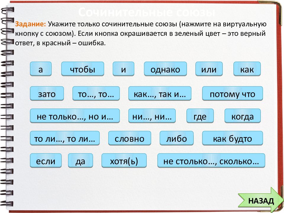 Задание: Укажите только сочинительные союзы (нажмите на виртуальную кнопку с союзом). Если кнопка окрашивается в зеленый цвет – это верный ответ, в красный – ошибка. а чтобы однако и или как то…, то … зато как…, так и… потому что не только…, но и… ни…, ни … где то ли…, то ли… когда не столько…, сколько… как будто словно если либо да хотя( ь ) НАЗАД