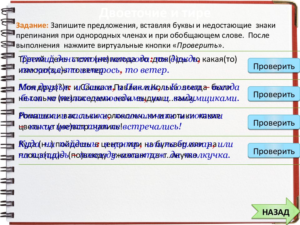 Задание: Запишите предложения, вставляя буквы и недостающие знаки препинания при однородных членах и при обобщающем слове. После выполнения н ажмите виртуальные кнопки « Проверить ». Проверить НАЗАД Третий день стоит (не)погода то дож(?) дь то какая(то) изморо ( з,с ) ь то ветер. Третий день стоит непогода : то дождь, то какая-то изморось, то ветер. Проверить Моя друз(?)я и Сашка и Павлик и Колька всегда были не только (не) поседами но и выдумщ.. ками. Моя друзья : и Сашка, и Павлик, и Колька – всегда были не только непоседами, но и выдумщиками. Проверить Ромашки и вас.. льки колокольч.. ки и лютики какие цветы тут (не) встр.. чались ! Ромашки и васильки, колокольчики и лютики – какие цветы тут не встречались ! Проверить Куда (н..) пойдешь в центр или на бульвар или на площа ( т,д ) ь (по)всюду ажиотаж да т.. лкучка. Куда ни пойдешь : в центр, или на бульвар, или на площадь – повсюду ажиотаж да толкучка.