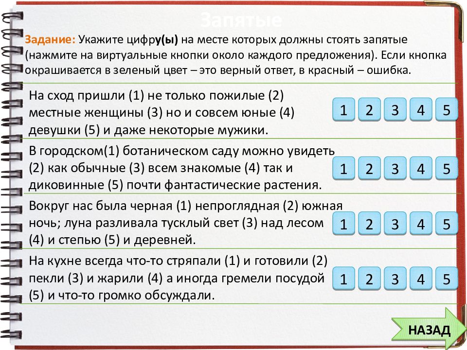 В городском(1) ботаническом саду можно увидеть (2) как обычные (3) всем знакомые (4) так и диковинные (5) почти фантастические растения. На сход пришли (1) не только пожилые (2) местные женщины (3) но и совсем юные (4) девушки (5) и даже некоторые мужики. Запятые Задание: Укажите цифр у( ы ) на месте которых должны стоять запятые (нажмите на виртуальные кнопки около каждого предложения). Если кнопка окрашивается в зеленый цвет – это верный ответ, в красный – ошибка. НАЗАД 1 2 3 4 5 1 2 3 4 5 Вокруг нас была черная (1) непроглядная (2) южная ночь; луна разливала тусклый свет (3) над лесом (4) и степью (5) и деревней. 1 2 3 4 5 На кухне всегда что-то стряпали (1) и готовили (2) пекли (3) и жарили (4) а иногда гремели посудой (5) и что-то громко обсуждали. 1 2 3 4 5