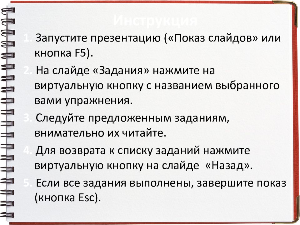 1. Запустите презентацию («Показ слайдов» или кнопка F5 ). 2. На слайде «Задания» нажмите на виртуальную кнопку с названием выбранного вами упражнения. 3. Следуйте предложенным заданиям, внимательно их читайте. 4. Для возврата к списку заданий нажмите виртуальную кнопку на слайде «Назад». 5. Если все задания выполнены, завершите показ (кнопка Esc ).